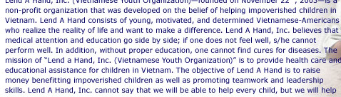 As of November 25, 2008, Lend A Hand Vietnamese Youth Organization, Inc is now 501(c)(3) certified.